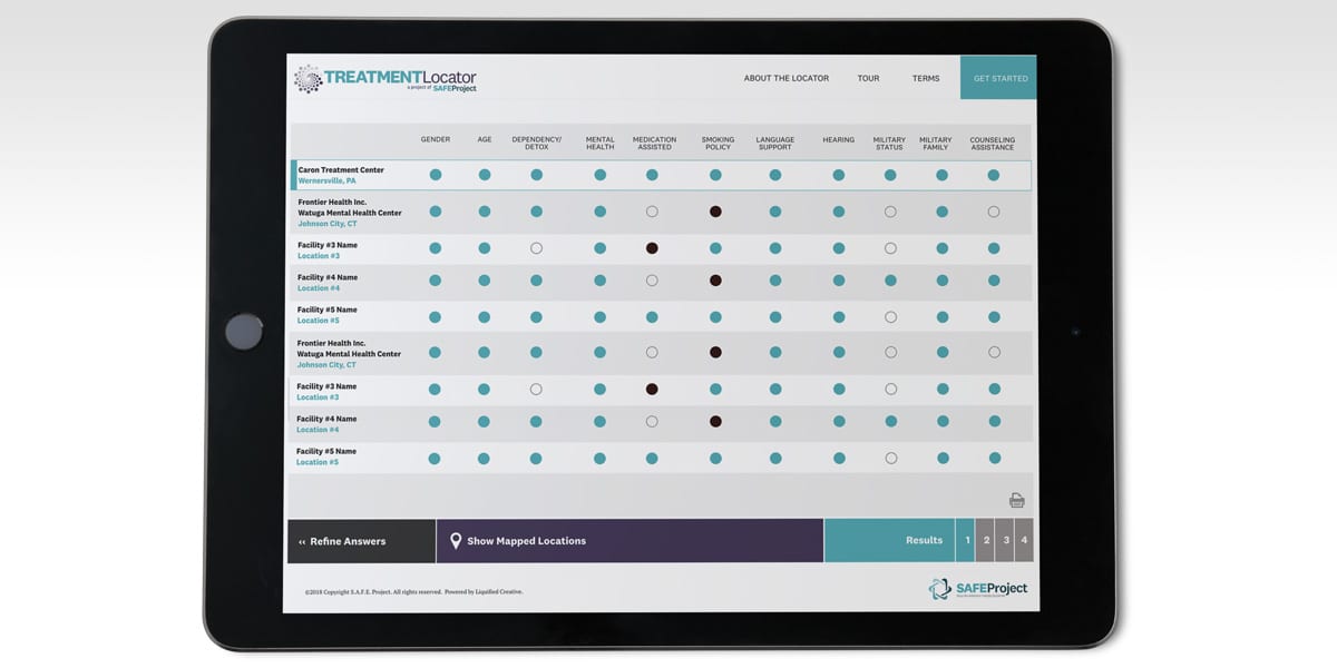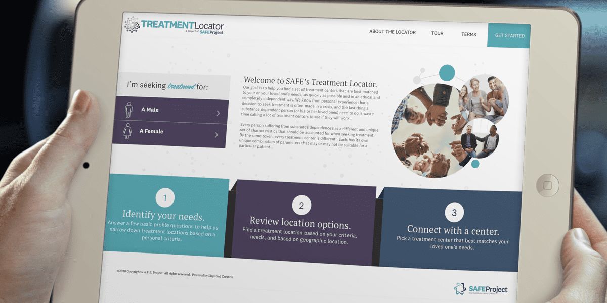 The Liquified Creative crew developed a web-based application and website that allowed users to pre-define parameters based on their lifestyle, needs, current treatment status, location, and dependances in order to filter and define an active treatment center that met their specific criteria. The application sourced active and up-to-date data available through a national database which refreshes on a daily basis. The user’s personal identity is not defined and kept anonymous and the data selected is non-bias.